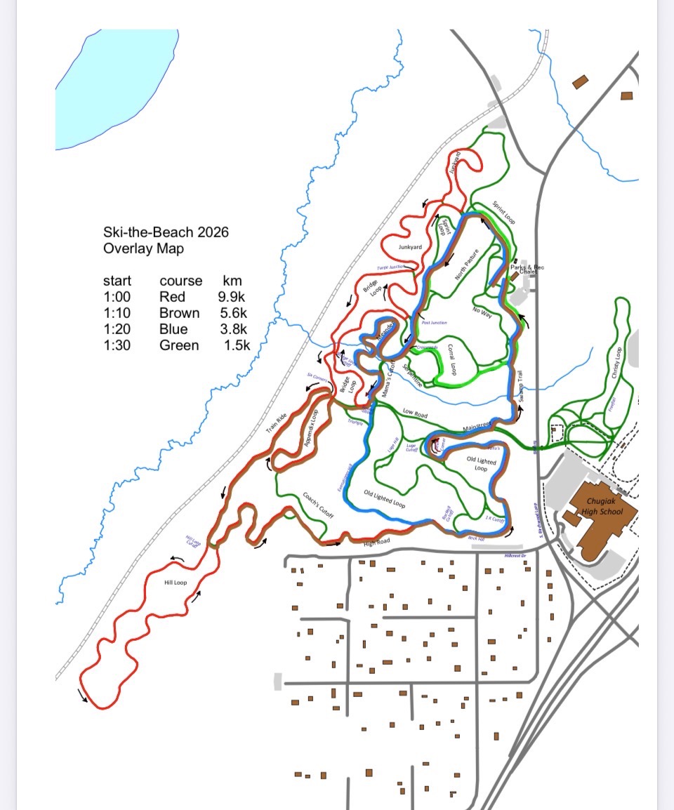Please park at Chugiak High School and ski to chalet if you can due to limited parking. The race starts will all be held at the Beach Lake Chalet. (17611 S Birchwood Loop Rd, Chugiak, AK 99567).